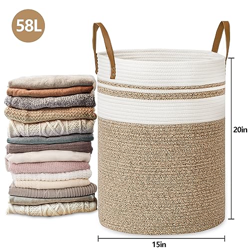UBBCARE 58L Cotton Laundry Basket, Large Woven Rope Laundry Basket with Leather Handles, Dirty Clothes Hamper for Blankets, Toys, Living Room, Bedroom, Brown & White