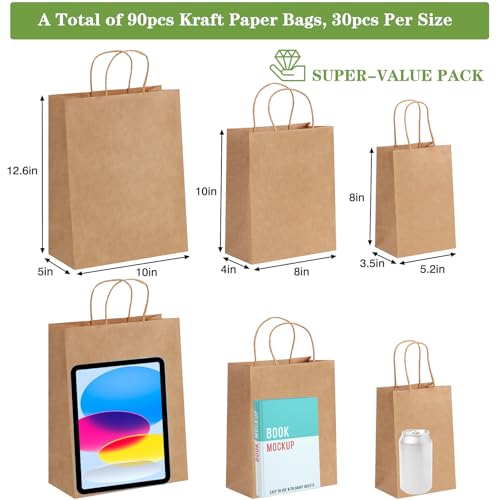 Super-Value Paper Bags Set: 90pcs brown paper bags in total, include 3 sizes: 5.2×3.5×8″, 8x4x10″, 10x5x12.6″, each size 30 pack. You can choose small, medium, and large kraft paper bags to meet your different needs, great for parties, birthdays, shopping, business, and merchandise.