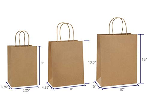 Perfect Size Paper Bags. 5.25×3.75×8& 8×4.25×10.5& 10x5x13 Inch, 25pcs each size. These brown gift bags with handles are made of 100% Recycled Paper. FSC COMPLIANT. Green your life, BagDream paper bags is your first choice.