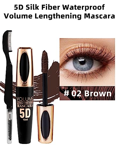 Brown Waterproof Mascara for Eyelashes, 5D Silk Fiber Mascara with Folding Eyelash Comb Brush, Liquid Colored Mascara Lash Extensions, Volumizing and Thick, Smudge-proof Long Lasting, Party Stage Use