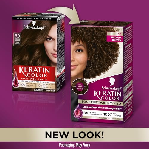 Schwarzkopf Keratin Color Permanent Hair Color, 5.0 Medium Brown, 1 Application – Salon Inspired Permanent Hair Dye, for up to 80% Less Breakage vs Untreated Hair and up to 100% Gray Coverage