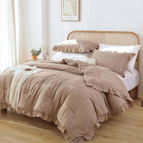 JANZAA Queen Ruffled Comforter Set 3PCS (1 Taupe Comforter Set and 2 Pillowcases) Vintage Farmhouse Shabby Chic Bedding Soft Fluffy Comforter Set All Season