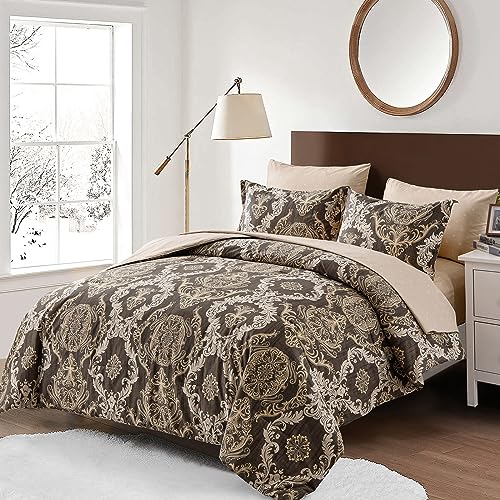 BROWN DAMASK COMFORTER SET: The comforter queen size set design with light brown damask pattern. Combined with leaves branches pattern and luxurious textured gives this bedspread a stylish and luxurious atmosphere. The 7 pieces comforter sets gives an eye-catching update to your bedroom decor.
