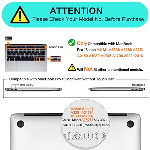 ONLY compatible with MacBook Pro 13 inch 2023-2016 (M2 M1 A2338 A2289 A2251 A2159 A1989 A1706 A1708 –MNEP3LL/A,MNEQ3LL/A,MNEH3LL/A,MNEJ3LL/A,MYD92LL/A,MYDC2LL/A,MYD82LL/A,MYDA2LL/A,MUHN2LL/A,MUHQ2LL/A,MUHP2LL/A,MUHR2LL/A,MV962LL/A,MV992LL/A,MV972LL/A,MV9A2LL/A,MR9Q2LL/A,MR9R2LL/A,MPXV2LL/A,MPXX2LL/A,MPXW2LL/A,MPXY2LL/A,MPXQ2LL/A,MPXR2LL/A,MPXT2LL/A,MPXU2LL/A,MLL42LL/A,MLH12LL/A,MLVP2LL/A,MNQF2LL/A,MNQG2LL/A,MXK32LL/A,MXK62LL/A,MXK52LL/A,MXK72LL/A,MWP42LL/A,MWP72LL/A,MWP52LL/A,MWP82LL/A).