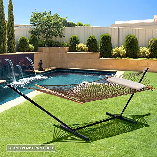 Heavy Duty Double Hammock: With 14 inch steel chain at each end, the total Length can be 13.3 feet. The bed dimension is 78.7 x 55.1 inches. There is plenty room for two adults. Max weight capacity: 450 lbs. You can share the relaxation with your friends or family members. Feel free to contact us if you have any questions during use within one year of purchase. We are always here to help.