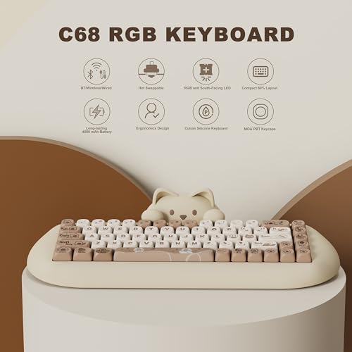 YUNZII C68 Wireless Mechanical Keyboard, 65% Gaming Keyboard Hot Swap,Triple Mode BT5.0/2.4G/Wired,RGB Backlit NKRO,Cute Cat Silicone Ergonomic Keyboard for Win/Mac(Milk Switch,Brown)