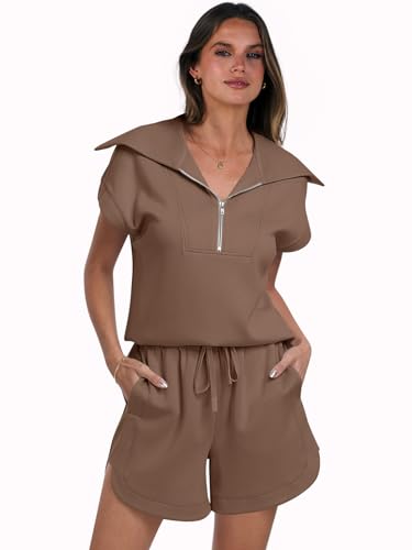 ANRABESS Two Piece Sets for Women Summer Half Zip Short Set Sweatsuit 2 Piece Outfits Sweat Lounge Sets Tracksuit brown Large