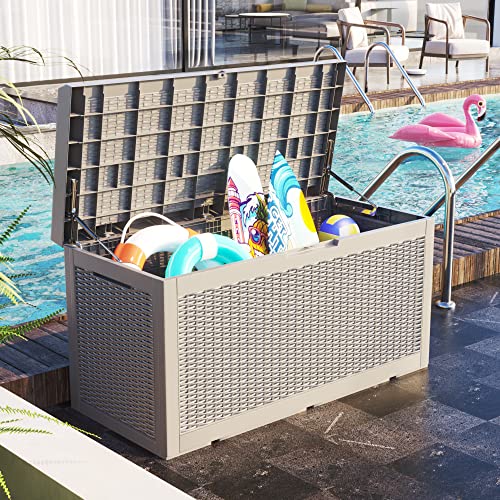 Greesum 100 Gallon Resin Deck Box Large Outdoor Storage for Patio Furniture, Garden Tools, Pool Supplies, Weatherproof and UV Resistant, Lockable, Light Brown