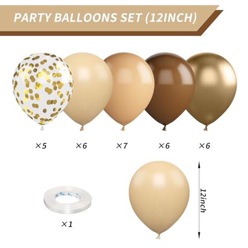 ?12 Inch brown and gold balloons: Package content includes 6 pcs brown balloons, 6 pcs cream balloons, 7 pcs Khaki balloons,6 pcs sand gold balloons,5 pcs gold conffeti balloons, a balloon ribbon.The perfect color combination meets all your party imagination.