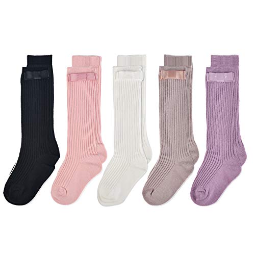 Epeius 5 Pairs Baby Girls Cotton Ribbed Knee High Socks Uniform Socks Toddlers Girls Tube Bow Stockings for 1-2 Years,Black/White/Violet/Baby Pink/Light Brown