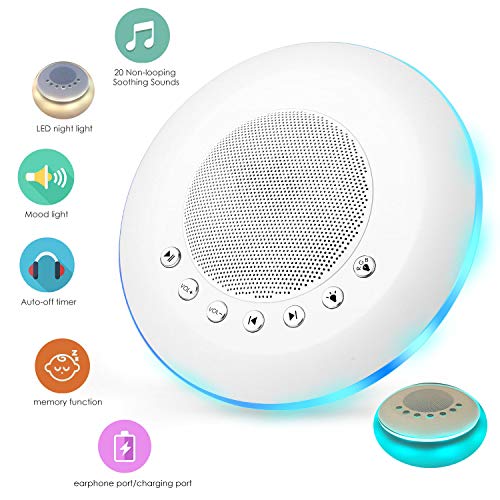 White Noise Sound Machine for Sleeping, 20 Non-Looping Soothing Sounds Lullaby Colorful Night Light Timing Baby Therapy Sound Machine, Auto-Off Timer Battery or USB Output Charger (White)