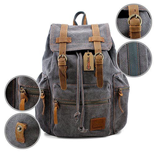 GEARONIC TM 21L Vintage Canvas Backpack for Men Faux Leather Rucksack Knapsack 15 inch Laptop Tote Satchel School Military Army Shoulder Rucksack Hiking Bag Gray