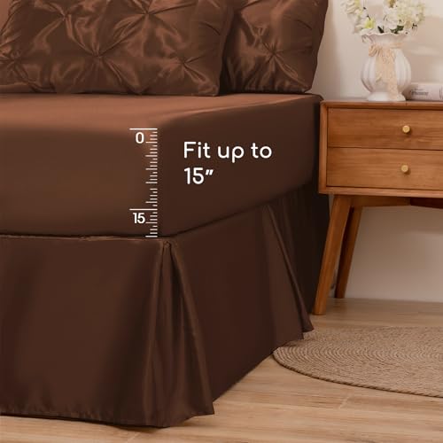 MR&HM Satin Comforter Queen 7 Pieces – Luxurious Pinch Pleat Bedding Set with Comforter, Flat Sheet, Fitted Sheet, Pillowcases & Shams, Super Silky Soft Bed Set for All Season (Queen, Brown)