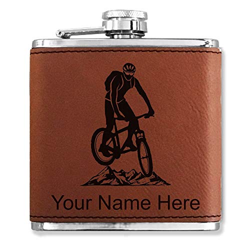 Faux Leather Flask, Mountain Bike, Personalized Engraving Included (Dark Brown)