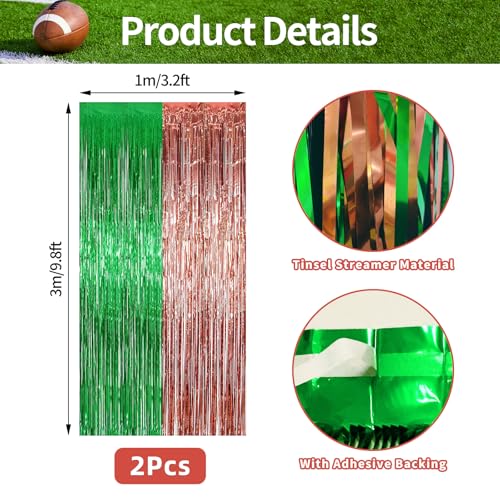 PREMIUM FOIL TINSEL MATERIAL: This 2 Pack 3.2ft x 9.8ft Football Party Metallic Foil Fringe Curtain is crafted from high-quality metallic tinsel. The brown and green colors add a unique touch, perfect for football-themed events, game days, and festive gatherings.