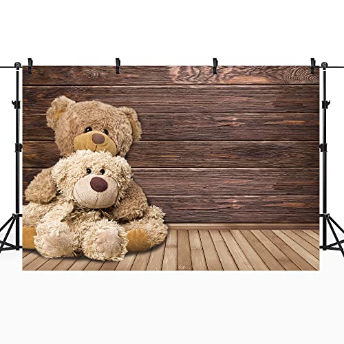 Riyidecor Wooden Board Bear Baby Shower Backdrop Children Happy Warm Cuddle Cute Lovely Brown Bear Dolls Plush Friends Party 7Wx5H Feet Photography Background Birthday Event Photo Studio Shoot