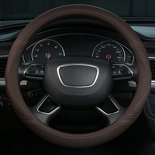 Click for More Images Top Quality: Heavy duty genuine leather steering cover, very soft and thickIncreased Safety: A better grip on the steering wheel gives you more control on the roadMiddle Size: Fits all standard size steering wheels from 14.5...