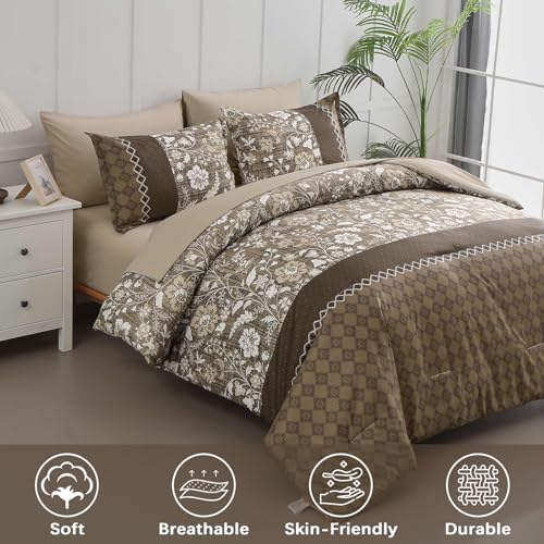 Click for More Images ?7 PIECES QUEEN BED IN A BAG?: Brown floral geometric patchwork comforter bed in a bag queen with 1 Comforter 90" x 90" + 2 Pillowcases 20" x 26"+ 1 Fitted Sheet 60"x 80"+14"+ 1 Flat Sheet 90"x 102"+ 2 Pillow Shams 20"x...