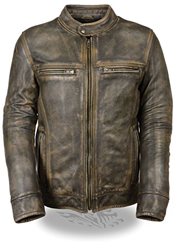 MEN'S MOTORCYCLE DISTRESSED BROWN SPORTY SCOOTER LEATHER JACKET W/2 GUN POCKETSMEN'S DISTRESSED RETRO BROWN SPORTY SCOOTER CROSSOVER JACKETDURABLE BUTTER SOFT LEATHERUNBEATABLE PRICEThis men's leather racer jacket features a quilted zip-out...