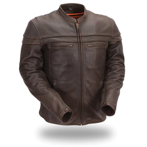 First Manufacturing Brown Small Men's Sporty Scooter Jacket features soft naked cowhide 1.1-1.3 millimeter available in black or brown color. It has a modern fit, mandarin collar, stripe detailing and hidden zippers that give a sporty look. It has...