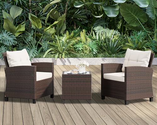Click for More Images ?High Quality Rattan?DUMOS Patio Furniture Set 3 Pieces are made of rattan wickers that make this outdoor furniture looks fashion and modern. Our all-weather rattan chairs adopts exquisite craftsmanship which is comfortable,...