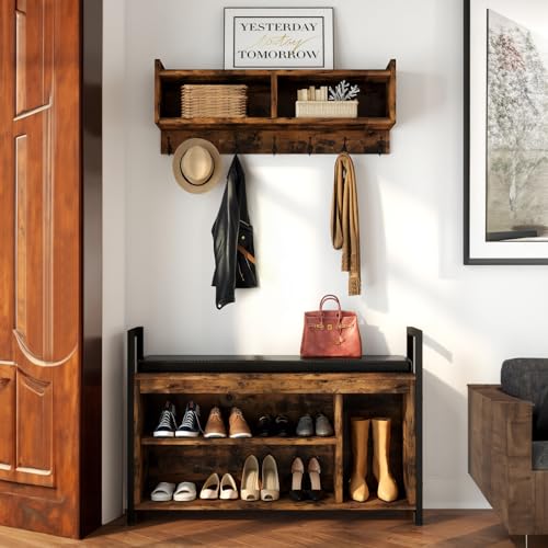 Click for More Images Rustic and elegant: YITAHOME coat rack wall mount with shoe storage bench features comfortable leather cushions, rustic warm particle board, and a black metal frame, adding more charm and complementing your home decorLarge...