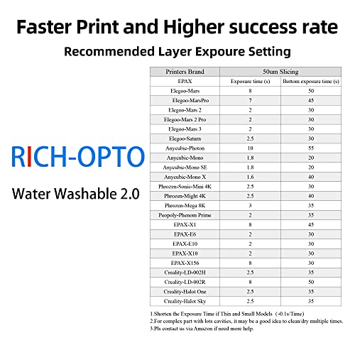 Click for More Images Faster Printing: Water washable Resin 2.0 is faster than 1.0 and other brandsBetter Success Rate: The success rate is significantly higher than the Water washable resin 1.0Low Odor: Near to no Odor, Protect your family and...