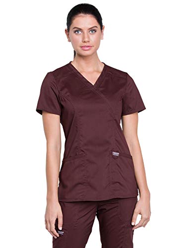 A Modern Classic fit mock wrap top features front shoulder yokes, two patch pockets, instrument loop, logo label with bungee loop, front and back princess seams and side vents. Center back length: 26" Women's mock wrap scrub topModern classic...