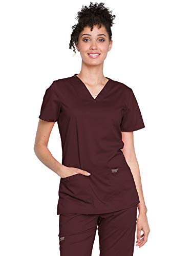 A Modern Classic fit V-neck top features patch pockets, an instrument loop, pencil stitch, logo label with bungee loop, back princess seams, and side vents. Center back length: 27" Women's v-neck scrub topModern classic fitTwo front patch...