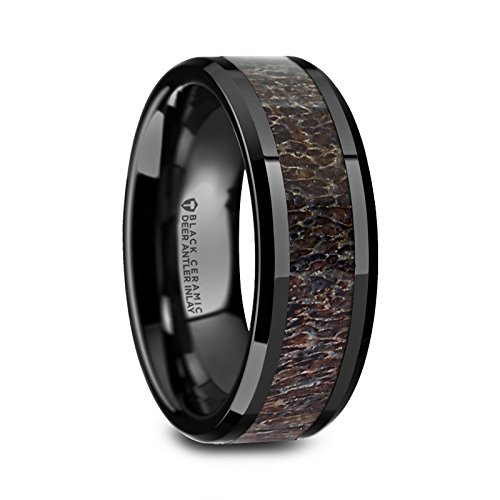 Composed from a dark brown antler inlay, this beautifully polished, beveled ring, introduces a subtle design element to this wedding band. It is made from strong ceramic, which is a very durable, fade resistant material. Skillfully inlaid in the...