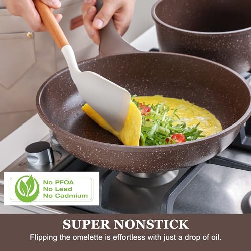 Click for More Images 5X NONSTICK - The surface is smooth and super nonstick, eggs can just slide right off the pan without effort, which makes cooking easier and the food much more flavorable with less oil!WOODGRAIN BAKELITE HANDLE - The...
