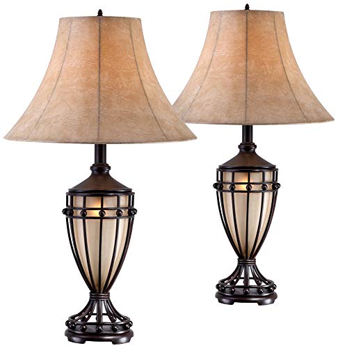 A dark brown and aged glass table lamp topeed with a textured art silk bell shade and features a 4-way switch and night light. TRADITIONAL TABLE LAMPS: You'll feel like royalty with this set of 2 lamps glowing in your bedroom or living room...