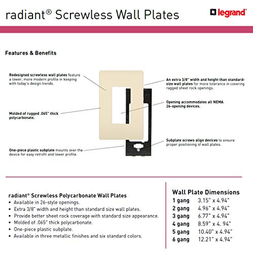 Click for More Images Radiant screwless wall plates feature a modern, low profile in keeping with today’s design trendsSmooth, Satin finish has no visible screws and matches radiant dimmers, switches, and outletsMolded of rugged thick...
