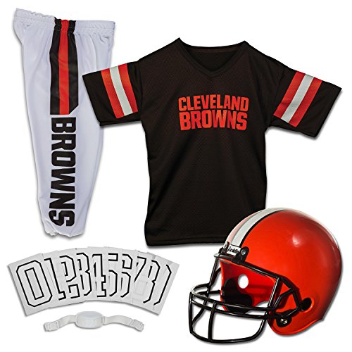National Football League Deluxe Youth Team Uniform Set from Franklin Sports includes a team logo helmet with chin strap, team logo jersey with shoulder pads, team pants and a iron-on number kit (#'s 0-9). Fits most kid's ages 7-9 years old....