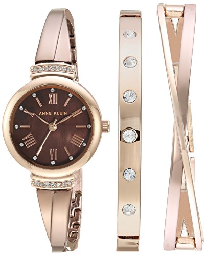 Rose gold-tone case and lugs set with swarovski crystals; brown mother-of-pearl dial with rose gold-tone hands and swarovski crystal accented markersLight brown bangle with adjustable links; jewelry clasp; set includes: one rose gold-tone bangle...
