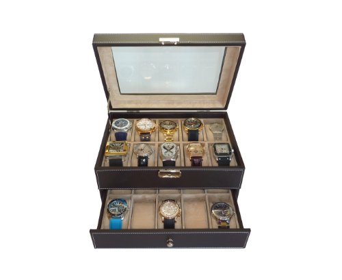 Store up to 20 of your finest watches in this elegant case, ideal for watches, cufflinks, jewelry, and small accessories. The hinged glass lid offers dramatic display for your collection, and the faux suede lining provides a luxury look and feel....