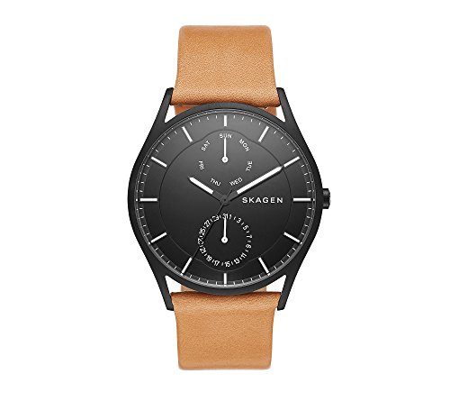 Featuring 2 inner sub-dials that display day and date, a convenient water-resistant design and refined look, the Skagen Denmark Men's Holst Watch in Black IP with Natural Leather Strap and Black Dial is the ideal blend of fashion and...