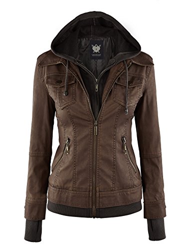WJC664 Womens Faux Leather Jacket With Hoodie L Coffee