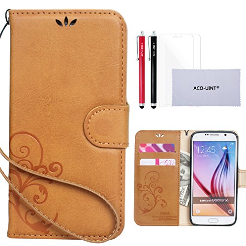 ACO-UINT Premium Vintage Emboss Flower Leather Wallet Case,Samsung S6 Case,Galaxy S6 Case,S6 Wallet Case,Folio Flip Book Magnetic Cover Strap Case for Samsung Galaxy S6[Light Brown]