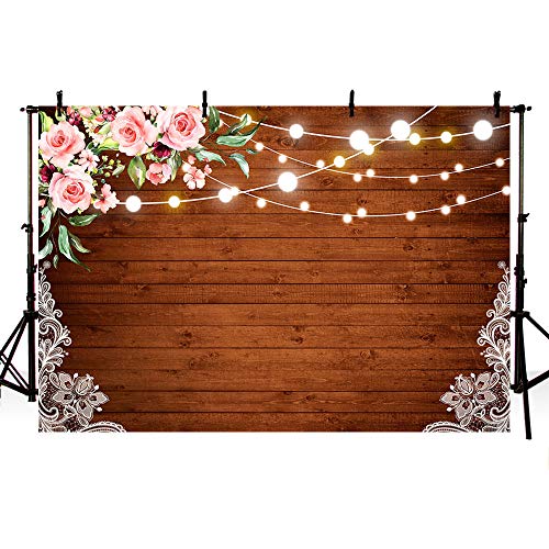 MEHOFOTO 8x6ft Rustic White Lace Pink Flowers Dark Brown Wood Shiny Lights Backdrop Wedding Floral Photography Background Wooden Board Floor Bridal Shower Baby Birthday Party Banner Photo Studio Props