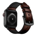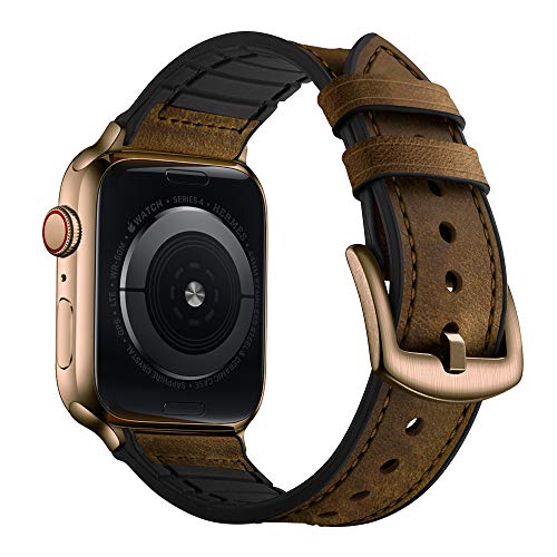OUHENG Compatible with Apple Watch Band 42mm 44mm, Sweatproof Genuine Leather and Rubber Hybrid Band Strap Compatible with iWatch Series 5 4 3 2 1, Retro Dark Brown Band