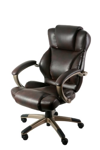 This executive chair has a contour seat and back with built in lumbar support and pneumatic seat height adjustment. It features dark brown bonded leather and matching upholstered armrests. It also has a butterfly seat plate with a memory foam cushion and a durable 5 star chocolate finished base.