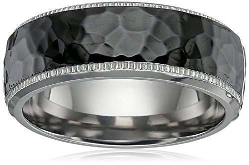This ring for men is constructed of titanium with a textured edge and a hammered central band with black ion plating. This ring offers a high polish inside for a comfortable fit.Finish your look with the fashionable Men’s Chocolate Ion Plated Titanium Hammered Ring. Crated out of sleek titanium material is an 8mm wide ring that is accented with hammered ion plating in black or brown. The plating is trimmed with diamond cut detailing that grants the ring a quality finish. Titanium material is extremely light weight, yet incredibly durable, allowing for constant comfortable wear.
