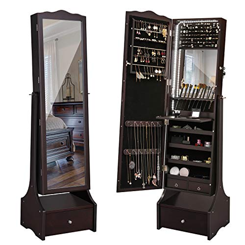 Specifications: – Color: Brown – Material: MDF, Velvet, Sponge, Glass – Simple Assembly: Yes – Built-in Mirror Size: 9 1/8”L x 9 1/8”H (23 x 23cm) – Large Mirror Size: 44 1/4”L x 11 5/8”H (112.5 x 29.5cm) – Cabinet Size: 48 1/4”H x 14 3/8”L x 4 1/2”W (122.5 x 36.5 x 11.5cm) – Overall Product Size: 59 1/8″H x 16 1/8”L x 14 3/8”W (149 x 41 x 36.5cm) – Product Weight: 48.4lbs (22kg) Package Contents: – 1 x Jewelry Cabinet – 1 x Instruction SONGMICS Notes: – Please don’t place it in damp areas to avoid deformation. – Please remove batteries when the LED lights are not used for a long time.