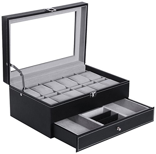 BEWISHOME Watch Box Organizer Case 12 Mens Jewelry Display Drawer w/ Adjustable Tray Glass Top PU Leather SSH02BZ