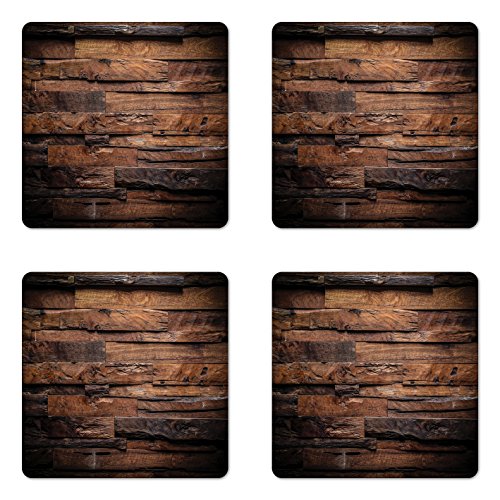 Ambesonne Chocolate Coaster Set Four, Rough Dark Timber Texture Image Rustic Country Theme Hardwood Carpentry, Square Hardboard Gloss Coasters Drinks, Brown Dark Brown