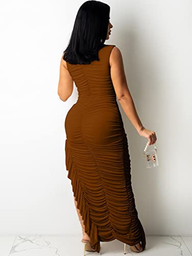 BEAGIMEG Women’s Sexy Ruched Sleeveless Asymmetrical Ruffles Elegant Cocktail Evening Party Maxi Dress Brown