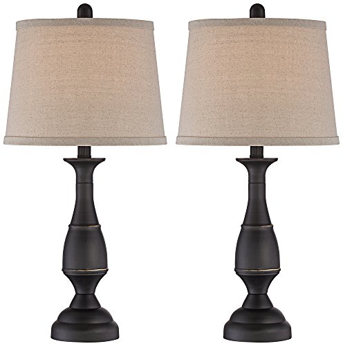 Stylish and understated, this matching table lamp set features a rich dark bronze finish. Each of the two designs features a classic profile in metal construction. Paired with a linen drum lamp shades. Clean and neutral enough to complement a bedroom, living room or entertaining space.