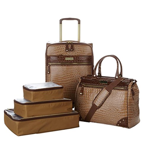WHAT YOU GET 21″ wheeled upright spinner Dowel bag 3 packing cubes SPECS Hardware: Goldtone Exterior: Upright and dowel bag made of glazed croco-embossed PVC with contrasting trim FEATURES Upright Corner guards Stabilizing bars Elastic garment straps Self-repairing zippers Removable zippered clear cosmetic pouch Dowel Bag Extra-wide top opening Elastic garment straps Goldtone feet Self-repairing zippers Bottom storage pocket Exterior back Peace of Mind pocket lined with RFID blocking material to help prevent “skimming” of credit cards or passports Front padded pocket protects your tablet Packing Cubes Perfect for keeping clothes and accessories organized Help you pack more in Made of lightweight, durable microfiber with a clear top so you can see what’s inside More Features Croco-embossed, water- and stain-resistant exteriors on upright and dowel bag Contrasting trim on all pieces Upright Measurements: Approx. 14-1/2″L x 10″W x 21-1/2″H Dowel Measurements: Approx. 16″L x 7-1/2″W x 13″H
