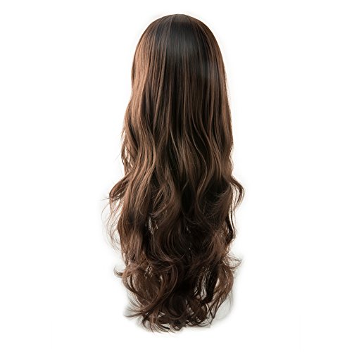 NEWYEARN BEAUTY 28 Inch Dark Brown Long Curly Wavy Wigs Heat Resistant Fiber Glueless Large Part Space Lace Hairpiece Hair For Girls And Women